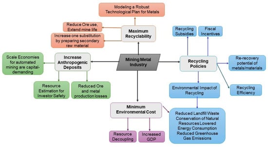 A rising demand for metals is one of modern society’s main issues. Low metal recycling rates and rising demand for high-tech items require more mining, with environmental, health, energy, water, and CO2 impacts [9,10]. Metals are not “going out” or being destroyed; they are scattered across the technosphere, making recuperation difficult and expensive. Due to global economic fluctuation and quick technological advancement, the recycling potential does not account for the total processing cost and hence cannot consistently reflect the nature of recycling technology [11,12,13].
