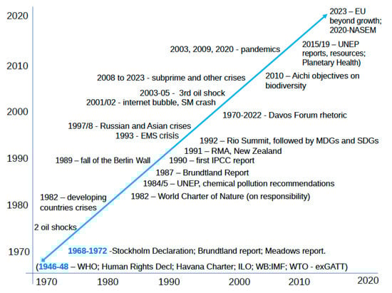 The geopolitical and institutional context of the last 50 years is characterized by the time of crises (ordinate axis), which were essentially financial and energetic, and the time of institutional and diplomatic agendas and rhetorics (abscissa axis). This landscape expresses, in various forms and with varying intensity, the shared responsibility and the urgent need for appropriate measures to protect nature and its resources at the national and international, individual and collective, and private and public levels. The list of examples is not exhaustive (for example, Brexit). Notes and abbreviations: WHO, World Health Organization; ILO, International Labor Organization; IMF, International Monetary Fund; WB, World Bank; WTO ex-GATT, World Trade Organization; IPCC, International Group of Climate Experts; EMS, European Monetary System, and more general awareness of the limits of free capital movements; RMA, Resource Management Act; MDGs, Millennium Development Goals; SDG, Sustainable Development Goals; SM, Stock Market; UNEP, United Nations Environment Program; NASEM, National Academies of Sciences, Engineering, and Medicine of the United States—Nobel Prize call and report on the science of sustainability.
