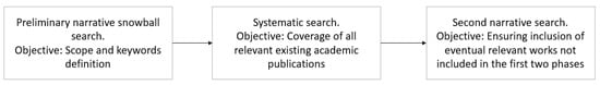 Scheme of the adopted literature search methodology, including a preparatory narrative search, the systematic search, and a second narrative search to include relevant artifacts contained in reports missed out by the previous two searches.