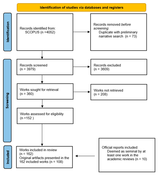 The results of the systematic search provided 4052 documents. In the first step of the analysis, 3682 documents were discarded. In the second analysis step, 208 further works were discarded. In the end, 152 works were included. Finally, in the second complementary narrative review, 10 more relevant documents, all from official reports, were included. Thus, finally, 162 works were counted as relevant for the review. The selection process is shown in Figure 2.