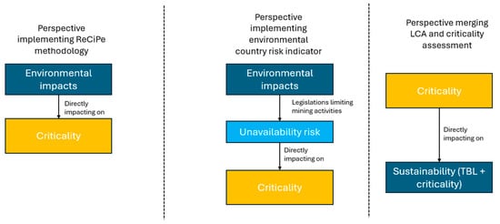 The three main identified perspectives of relations between environmental sustainability and criticality, respectively, embedding ReCiPe methodology in the criticality assessment without referring to LCA, using the national environmental risk and performance index, and merging criticality assessment into LCA, are summarized in Figure 4.