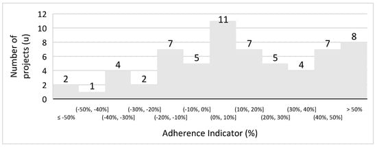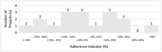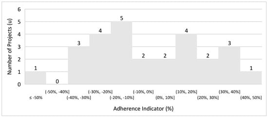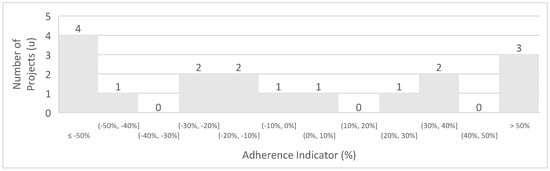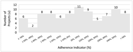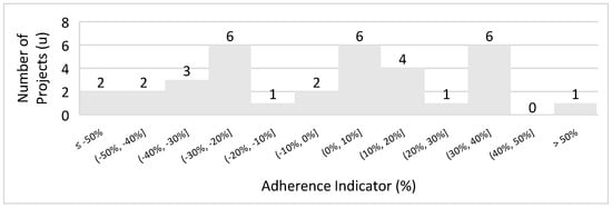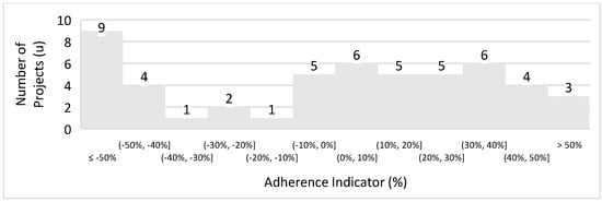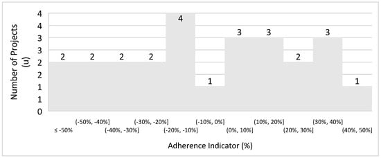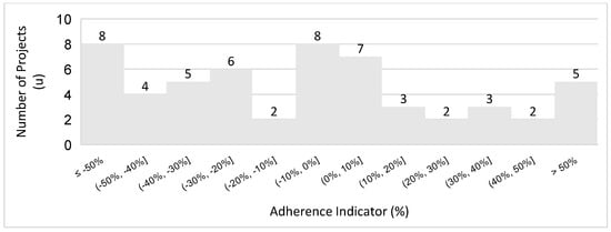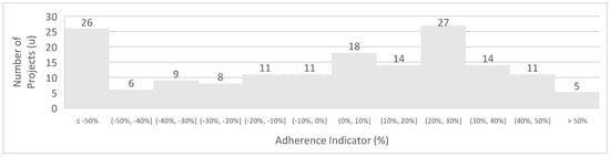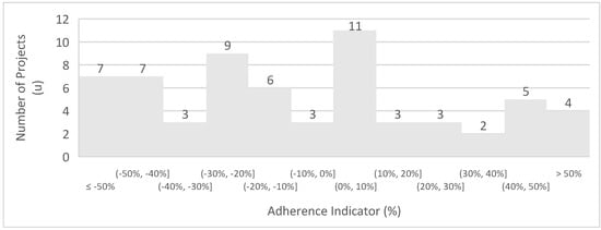 The histogram reveals that a significant number of projects deviate beyond the 30% variance threshold considered for formula adherence. Of the 160 projects evaluated, 89 remained within the acceptable 30% margin of the production rate differences calculated by the equation compared to the project’s reported values. This equates to an adherence rate of 56%. While this rate is comparable to those achieved with previous formulae, it falls short of being considered satisfactory by the adherence comparison methodology. The analysis of the statistical measures reinforces the low statistical relationship of the sample space. The values are as follows: mean = −13%, standard deviation = 76%, and standard error = 6%.