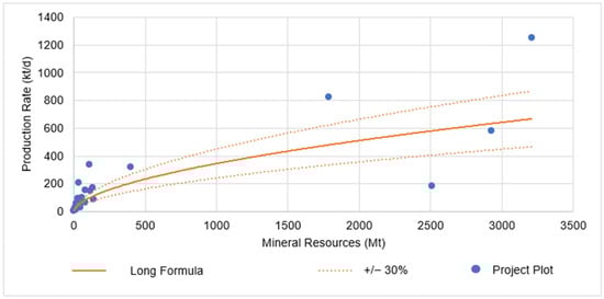 Comparative scatter plot illustrating the adherence of open−pit project production rates to Long’s [22] equation.