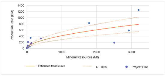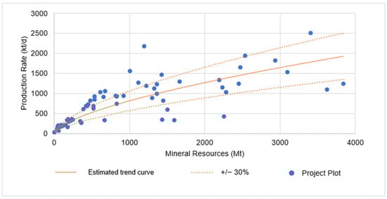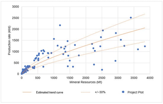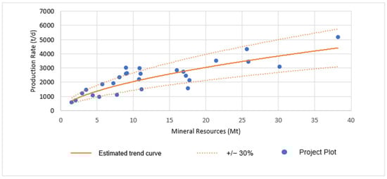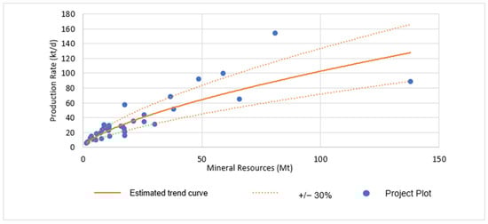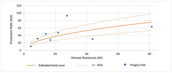 In Figure 7, the distribution of projects is depicted, with mineral resources plotted on the x-axis in millions of tons and the daily production rates on the y-axis in tons. Additionally, the figure shows the trend curve resulting from a power regression analysis of the data, which includes a 30% allowable variation above and below the equation. This power regression was calculated using the least squares method. The trend curve is derived from Equation (4):