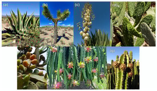 Arid zone plants: (a) agave, (b) Yucca, (c) Yucca flowers, (d) opuntia cladodes and (e) fruit, (f) pitahaya, and (g) pitaya.