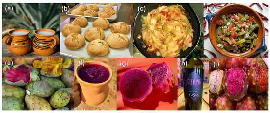 Traditional food uses of arid zone plants: (a) pulque, (b) pulque bread, (c) Yucca flower dish, (d) Nopales dish, (e) prickly pear fruit, (f) artisanal fermented prickly pear juice (Colonche), (g) dragon fruit (pitahaya), (h) pitahaya wine, and (i) pitaya fruit (“tuna de pitaya”).