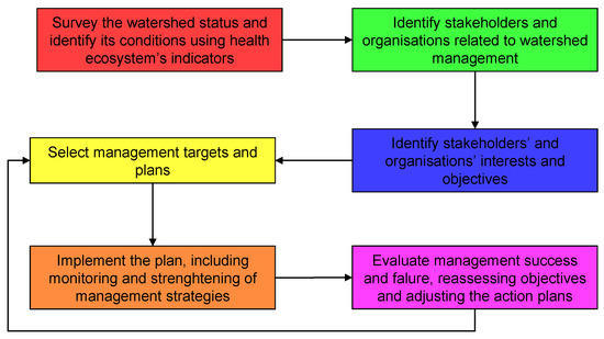 In general, ref. [1] identified six steps for the integrated watershed management process (Figure 1): (1) survey of the status of the watershed and identification of its situation; (2) identification of stakeholders; (3) selection of interests and objectives; (4) setting up of the target and plan; (5) implementation of the plan; and (6) evaluation of management success and failures, reassessment of objectives, and adjustments of the plan to improve management success.