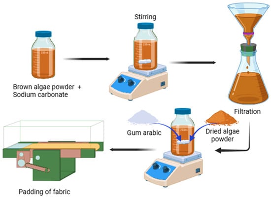 To extract alginate from brown algae (Figure 1), a two-step process was employed. Brown algae, rich in alginate and other polysaccharides, underwent initial treatment with a sodium carbonate solution (4 g in 100 mL distilled water) for 24 h to enhance alginate solubility. The resulting mixture was filtered, and the residue was washed thrice with distilled water to remove excess salts. Subsequently, mineral removal was achieved by immersing the alginate residue in a dilute hydrochloric acid solution (3 mL HCl in 100 mL water) for 24 h. The acid-treated residue was then washed extensively with distilled water until a neutral pH was attained. To regenerate alginate, the purified residue was combined with a sodium carbonate solution (4 g in 100 mL distilled water) and heated under magnetic stirring for 30 min. Gum arabic (3 g) was added to the alginate solution and stirred for an hour at 70 °C. The final mixture was applied to a 7 g (0.2 pore size) knitted fabric using a padder machine and dried in an oven.