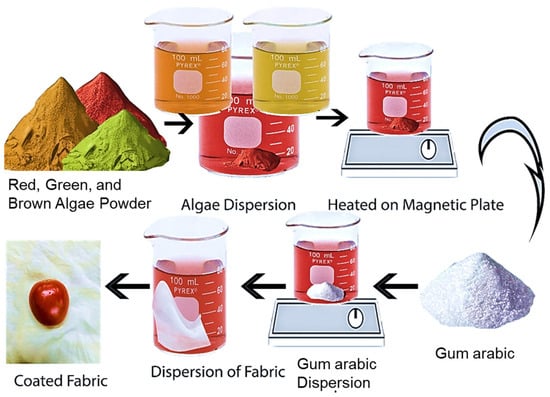 Red and green algae powders (2 g) were dispersed in 100 mL distilled water separately and subjected to a 24 h hydration period to enhance viscosity and consistency. Subsequently, the suspensions were heated to 80 °C for 30 min under magnetic stirring at 80 rpm. Following a cooling and filtration step, 2 g of gum arabic was incorporated, and the mixture was boiled at 80 °C for 30 min. The resulting algal solution was then applied to 7 g knitted fabric specimens (with a pore size of 0.2) using a padder machine before undergoing oven drying. All experimental parameters adhered to the protocol outlined in Table 1.