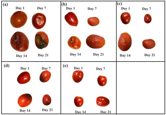 Texture of tomato stored in (a) uncoated knitted fabric packaging (control), (b) brown algae with gum arabic, (c) green algae with gum arabic, (d) red algae with gum arabic, and (e) green, brown, and red algae with gum arabic.