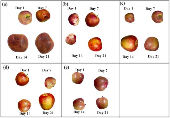 The texture of apples stored in (a) uncoated knitted fabric packaging (control), (b) red algae with gum arabic, (c) green algae with gum arabic, (d) brown algae with gum arabic, and (e) green, brown, and red algae with gum arabic.