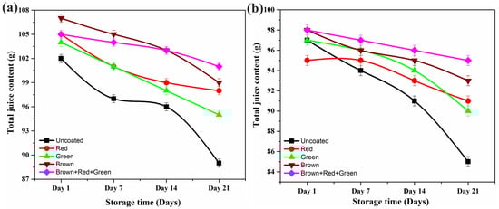 Figure 7a,b illustrate the total juice content of tomatoes and apples at various storage intervals, with error bars demonstrating consistent experimental reliability across all measurements. This analysis is critical in assessing the storage duration and consumer appeal of coated fruits compared to their uncoated counterparts. For tomatoes, initial juice content varied from 102 to 107 g, with brown algae showing the highest starting values, while apples demonstrated more uniform initial content across treatments (~97–98 g). A detailed analysis of juice content after 7, 14, and 21 days of storage revealed that the most significant juice loss occurred between days 14–21, particularly in uncoated samples. The results indicate that fruits stored in red algae-coated packaging retained high juice content (tomatoes 98 g and apples 91 g) as compared to brown (tomatoes 99 g and apples 93 g), and green (tomatoes 95 g and apples 90 g), while those in uncoated knitted packaging exhibited the lowest juice content (tomatoes 89 g and apples 85 g) after 21 days of storage. The error bars throughout the storage period indicate good experimental reproducibility and statistical reliability of the preservation effects. Notably, the fabric coated with a combination of green, brown, and red algae provided the best results (tomatoes 101 g and apples 95 g), outperforming both uncoated and individually coated fabrics. This consistent superior performance across both fruit types, supported by the error bar analysis, demonstrates the synergistic effect of these three algae types in preserving the juice content and overall quality of the fruits. There is limited published research on the use of algae as a coating material for packaging, and no studies have explored the comparison of red, brown, and green algae blends in fruit packaging.