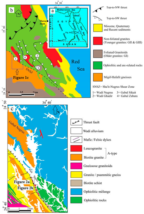 (a) Location map of the study area. (b) Geological map of the El Gemal-Hafafit district showing the major lithologies and structures. The NW-trending Sha’it-Nugrus shear zone (SNSZ) is shown as well as major thrusts (after [39]), and (c) a detailed geological map of the Wadi Nugrus area modified after [34].