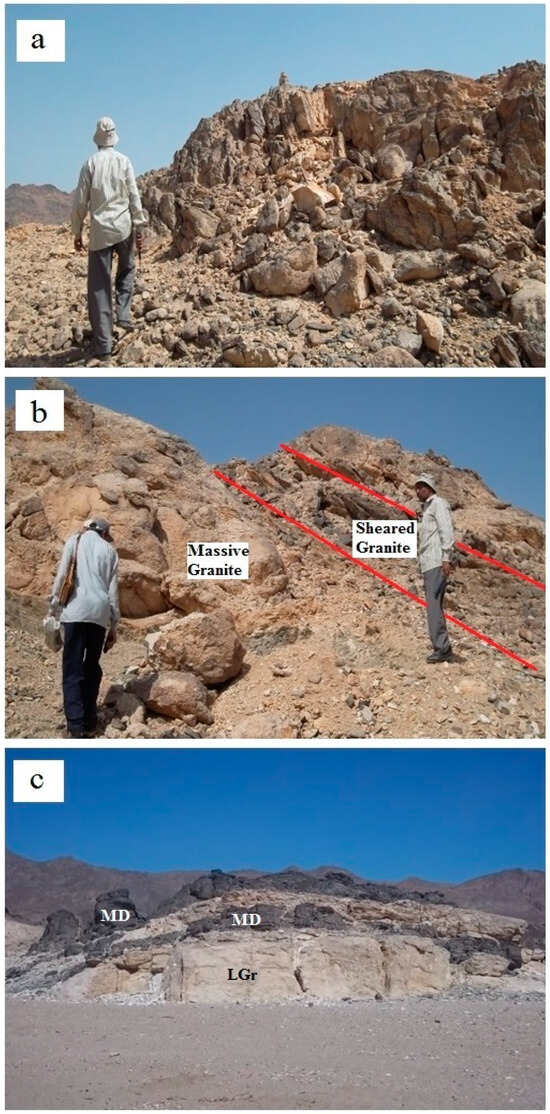 Within the Nugrus shear zone (Figure 2), a conspicuous mass of leucogranite (monzogranite) trending NNW-SSE intrudes into the arc-related rocks. This granite mass is intensively sheared and belongs to the GII or A-type younger granites of Egypt (610–590 Ma) [43] and occurs as elongated monzogranite that extends for a length up to 4.5 km and is 150–500 m wide. The mass is highly jointed (Figure 2a) and is dissected by NNW-SSE strike-slip faults, which causes the occasional dislocation of the leucogranite and the associated aplite and pegmatite dykes [43]. There are three sets of joints trending: N-S, NNE-SSW, and NW-SE. In some instances, there are xenoliths of older rocks, particularly the arc-related biotite schist, in the leucogranite. This leucogranite is highly jointed andsheared (Figure 3), and the width of the shear zone is variable (0.5 m to ˃20 m) with the darkening of sheared granite owing to the circulation of metal-rich hydrothermal fluids. At several exposures, the most distinct alteration is argillic and, to a much lesser extent, ferruginous and carbonaceous. Occasionally, the granite is traversed by NW-SE fresh mafic dykes (Figure 3c) and non-mineralized/barren quartz veins that trend N 35–50° E.