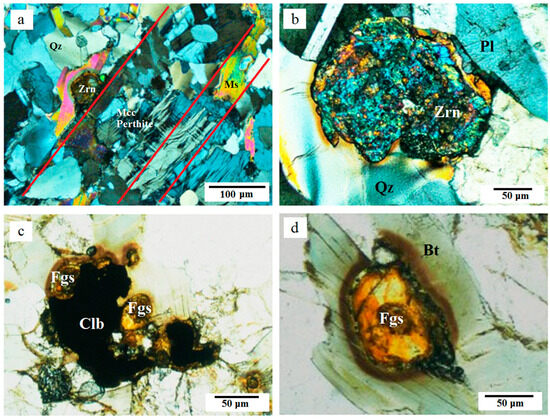 Photomicrographs of the sheared Nugrus leucogranite. (a) Shearing, defined by parallel red lines, in the leucogranite consisting of microcline (Mcc) perthite, quartz (Qz), plagioclase (Pl), muscovite (Ms), and zircon (Zrn), CN; (b) close-up view of coarse euhedral zircon (Zrn) in groundmass made up of quartz (Qz) and plagioclase (Pl), CN; (c) columbite (Clb) partly altered to fergusonite (Fgs), PPL; and (d) details of pleochroic haloes of fergusonite (Fgs) in biotite (Bt), PPL. CN = crossed-nicols and PPL = plane polarized light. The mineral abbreviations are recommended by the IMA [46].