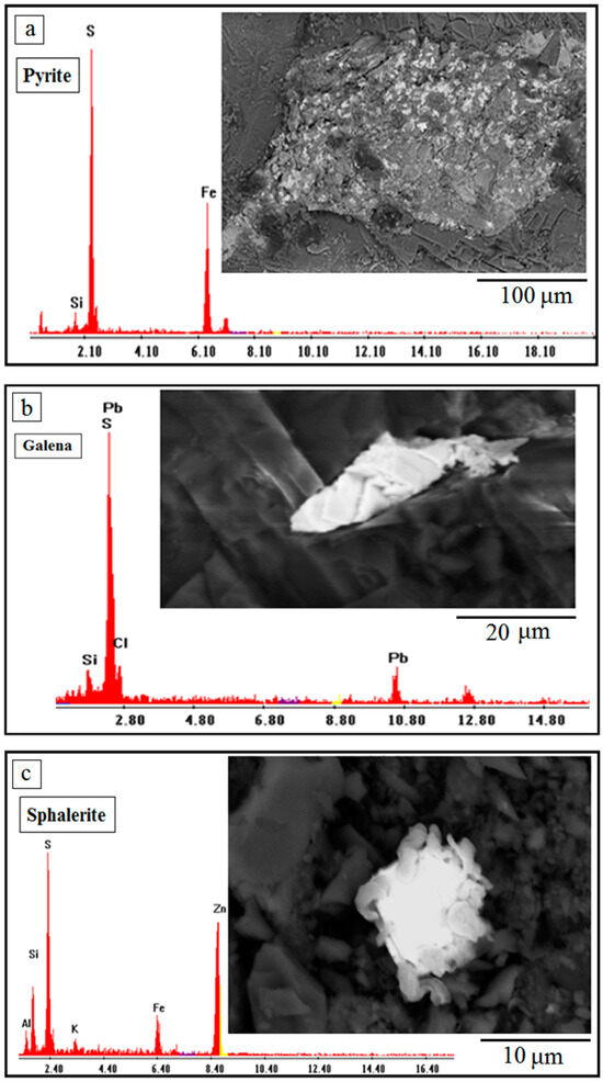 Spectral analyses and BSE images of sulfides captured by the scanning electron microscope. (a) Pyrite, (b) galena, and (c) sphalerite.