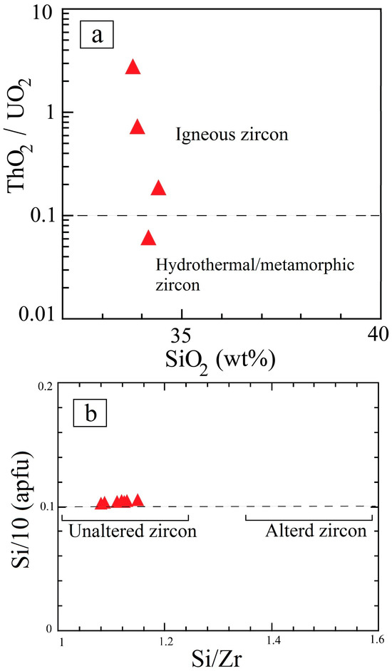 Based on ore mineral identification, textural relationships, and microanalytical data given in the results section, it is possible to define different stages of ore mineral crystallization and the paragenetic sequence. Figure 9 provides the suggested paragenetic sequence. Also, it distinguishes between minerals in the two primary stages, namely magmatic and hydrothermal. The microanalytical data in the Supplementary Table S1a–g and BSE images (Figure 5, Figure 6, Figure 7 and Figure 8) indicate that the magmatic stage witnessed the crystallization of zircon, thorite, ferrocolumbite (Figure 10a), and possibly some of the fergusonite. It is supposed here that the magmatic paragenesis of the magmatic stage might include primary phosphate minerals (apatite, monazite, and xenotime) that are completely destabilized during the hydrothermal alteration, furnishing a considerable amount of P that converts magmatic thorite into hydrothermal P-F-rich thorite (Figure 10b, Table 3). Zircon has a typical magmatic nature, as indicated by the ThO2/UO2 ˃ 0.1 (Figure 11a). A single odd analysis of zircon (Figure 11a) would suggest limited hydrothermal destabilization. Another support for the freshness of this magmatic zircon is confirmed by its Si/Zr ratio equal to 1.08–1.16 (Figure 11b). In the fresh and undeformed Nugrus leucogranite, sulfide minerals are rare or almost absent. Still, they are common in the deformed samples (Figure 8), indicating their hydrothermal origin and, accordingly, hydrothermal destabilization or rare-element minerals formed in a reducing condition. In brief, ore minerals in the hydrothermal stage are represented by sulfides (dominated by pyrite), P-F-rich thorite, fergusonite-Y, petscheckite, and uranopyrochlore. Altered uranothorite and betafite (Figure 7) are counted among the supergene mineral assemblage.