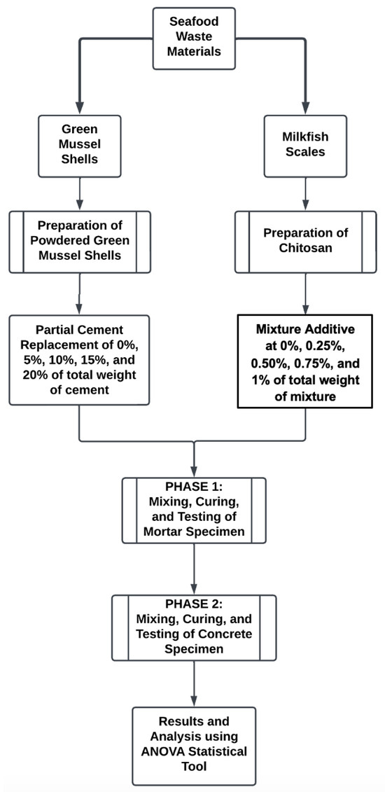 The study carried out a two-phase experiment, namely Phase 1 for the mortar testing, followed by Phase 2 for the concrete testing. The experiment started with sourcing out the seafood waste materials, GMSs, and milkfish scales. Ordinary Portland cement (OPC) was utilized in both experiments, while aggregates varied. In particular, this study used OPC by Republic Cement. In Phase 1, Ottawa sand was utilized following ASTM C109-20 [17], while standard sand and gravel were procured from a local construction supplier for the concrete phase. Figure 1 shows the research methodology, supplemented by the discussions in the succeeding sub-parts of this article.