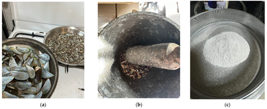 Experimental photos when (a) heating, (b) pulverizing, and (c) sieving the green mussel shells.