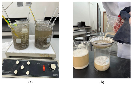The milkfish scales were also obtained from a wet market in Libertad, Pasay City, Philippines. The milkfish scales were cleaned using distilled water and dried using the oven for 24 h and sat for another 24 h at room temperature, ensuring improved quality of the extracted chitosan. Demineralization was performed by submerging the dried scales in a 2% HCl solution for 16 h at room temperature with a solid solvent ratio of 1:5 (weight-to-volume). The residue was washed until it reached neutral pH and was oven-dried for 12 h. Subsequently, deproteinization was executed by submerging the scale residue in a 4% NaOH solution for 20 h at room temperature with a solid-to-solvent ratio of 1:5. The residue was washed until it reached neutral pH and was oven-dried for 12 h. The last step for extraction involved submerging the residue for another 20 h in a 4% NaOH solution for deacetylation, but at 60 ± 5 °C with a solid/solvent ratio of 1:10. The residue was washed and oven-dried for 4 h at about 40 ± 5 °C. Figure 3a and Figure 3b display the deacetylation and straining of the chitosan samples, respectively.