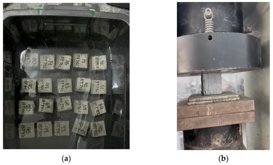 Mortar samples subjected to (a) curing and (b) testing.