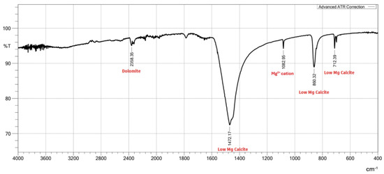Figure 6 displays the FTIR spectra for the GMSs used in this study, which were compared to the FTIR spectra of limestone and CaCO3 with and without Mg2+ at 400–4000 cm−1 [34,35]. The GMSa graph shows similar peaks compared to both graphs of the related literature at around 2356.35 cm−1, indicating the possible presence of dolomite, a limestone rich in CaCO3 and Magnesium Carbonate. The peaks at 1472.17, 860.32, and 712.39 cm−1 in Figure 5 show the presence of CaCO3 with low magnesium content [34]. Lastly, the peak at 1082.95 cm−1 can be attributed to the presence of magnesium cations, which is an impurity that can lead to lower 28-day compressive strength compared to its 7-day compressive strength, which expands the cement and also increases the rate of deterioration [7,10,12,35].