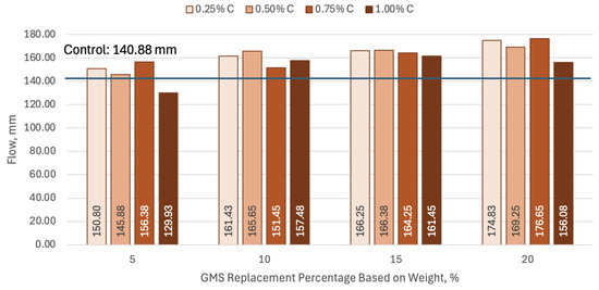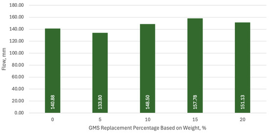 The setup that contains only GMSs had a maximum flow of 157.78 mm with a 15% GMS partial cement replacement, which increased by 12% in comparison to the flow of the control mixture. On the other hand, the 10% GMS partial cement replacement generated the lowest increase in the flow of the GMS-only setups, with a 5.41% difference from the control setup. With a 5% GMS partial cement replacement, the flow had decreased by 5.03%. These results are illustrated in Figure 8.