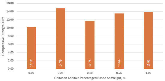 Compressive strength of mortar samples at varying chitosan additive percentages after 28 days of curing period.