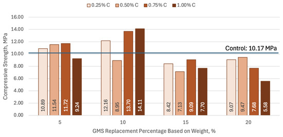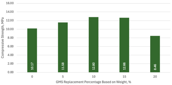 Compressive strength of mortar samples with varying GMS replacements after 28 days of curing period.