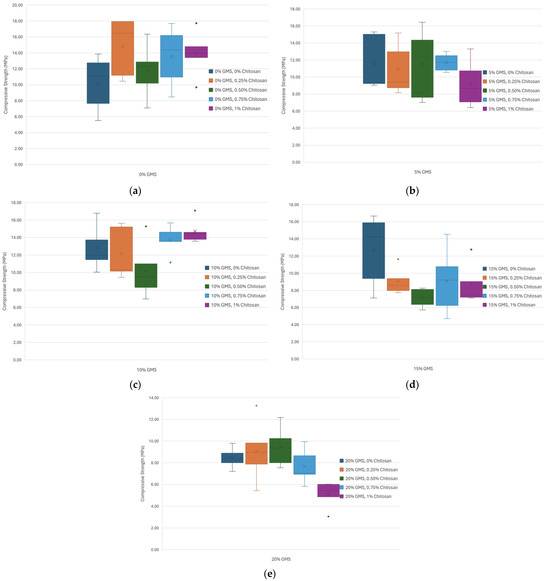 Prior to conducting ANOVA, the experimental results were plotted in a Box and Whisker plot. Figure 13a, Figure 13b, Figure 13c, Figure 13d, and Figure 13e present the Box and Whisker plots representing the experimental data of 0%, 5%, 10%, 15%, and 20% GMS replacement, respectively, with varying amounts of chitosan. Based on the Box and Whisker plot of each group, a total of 9 out of 125 mortar samples were found to be outliers. These outliers were removed in the corresponding data set moving forward.