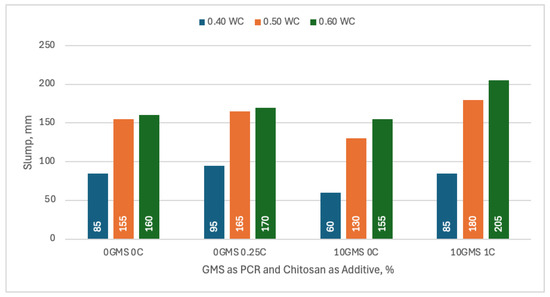 Figure 14 shows the comparison of the different values obtained from the slump test of the concrete samples. From the figure, it can be observed that the slump of the control setup at 0.40, 0.50, and 0.60 water/cement ratios is 85 mm, 155 mm, and 160 mm, respectively. Comparing this setup to the 0% GMS and 0.25% C setup, it can be seen that there was an increase of 10 mm in the slump for all of the mixes. In the 10% GMS and 0% C setup, a decrease in the slump, when compared to the control setup, was observed, with a 25 mm decrease in the 0.40 and 0.50 water/cement ratio mixes, while the 0.60 water/cement ratio sample had a 5 mm decrease in its slump. The 10% GMS and 1% C setup, when compared to the 10% GMS and 0% C setup, exhibited a 25 mm increase in the slump of the 0.40 w/c ratio mix, resulting in an equal slump with the 0.40 w/c ratio mix of the control setup. A 50 mm slump increase was observed from both the 0.50 w/c ratio mix and the 0.60 water/cement mix. However, only the 0.40 w/c ratio setups corresponded to the target slump of 75 mm to 100 mm in the mix design of concrete. The effect of utilizing GMSs as a CRP on the workability of concrete was observed to have decreased, similar to the study by Lejano [6]. Moreover, in accordance with the study by Lv [16], due to the ability of chitosan to adsorb water, the workability increased when 0.25% C is compared to the control setup and when 10% GMS and 1% C is compared to 10% GMS and 0% C.