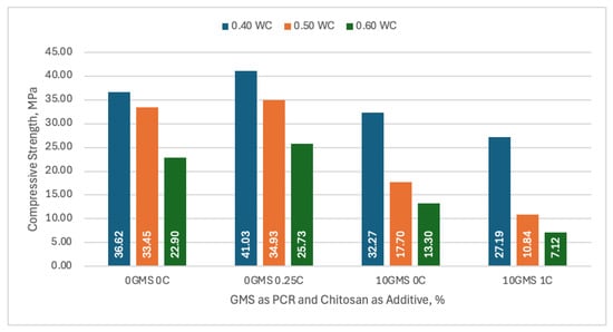 However, a noticeable decrease in compressive strength can be observed in the 10% GMS and 0% chitosan samples, with the 0.40, 0.50, and 0.60 water/cement ratios producing values of 32.27 MPa, 17.70 MPa, and 13.30 MPa, respectively. These compressive strength values, when compared to the control setup, resulted in a percent decrease of 12% for the 0.40 w/c ratio mix, a percent decrease of 47% for the 0.50 w/c ratio mix, and a percent decrease of 42% for the 0.60 w/c ratio mix. The compressive strength decreased further when 10% GMS was added with 1% chitosan additive, with the 0.40, 0.50, and 0.60 w/c ratio samples having a compressive strength of 27.19 MPa, 10.84 MPa, and 7.12 MPa, respectively, with percent decreases of 26%, 68%, and 69%, respectively.
