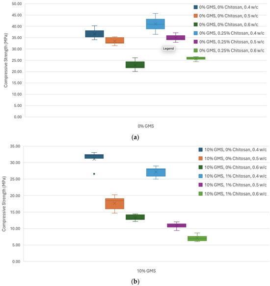 Box and Whisker plots for Phase 2 considering (a) 0% GMS and (b) 10% GMS, with varying chitosan content and water/cement ratios (w/c).