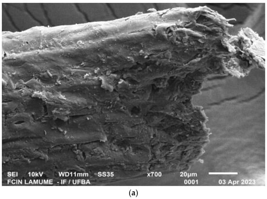 The morphological characterization of raw coconut fibers is presented in Figure 1a–c. Figure 1a shows the fiber extremity at 700× magnification, highlighting pronounced surface irregularities and a rough texture. Figure 1b,c display longitudinal views of the fiber at 250× and 700× magnifications, respectively, where a structure with well-defined fissures and cavities can be observed. The presence of superficial fissures and cavities, together with irregular roughness, plays a crucial role in oil adsorption. These structural features increase the specific surface area, promoting greater contact between the fiber and oil molecules. This roughness is intrinsically related to the chemical composition of coconut fibers, since their lignocellulosic structure is composed of cellulose microfibrils bound by hemicelluloses and lignin, which naturally generate heterogeneous surfaces with irregularities, fissures, and cavities [,]. SEM analysis confirms that raw coconut fibers exhibit highly favorable morphological characteristics, making them effective candidates for bioadsorbents in oil spill remediation.