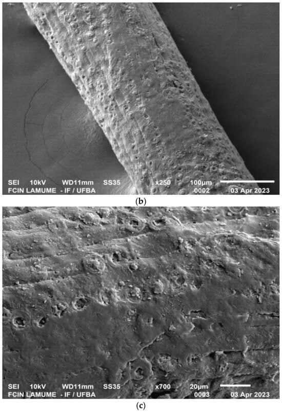 Scanning Electron Microscopy (SEM) images of raw coconut fibers: (a) fiber extremity at 700× magnification; (b) longitudinal view at 250× magnification; (c) longitudinal view at 700× magnification.