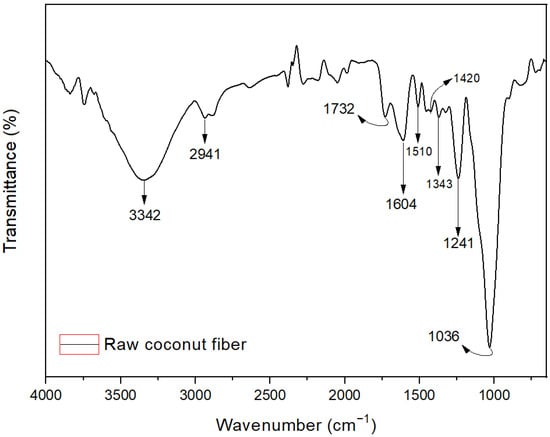 The surface chemistry of the raw coconut fiber was investigated by ATR-FTIR (Figure 2). The dominant broad band at ~3342 cm−1 is assigned to ν(O–H) stretching from hydrogen-bonded hydroxyls in cellulose, hemicelluloses, and lignin [,]. The band near ~2941 cm−1 corresponds to aliphatic ν(C–H) of methyl/methylene groups in the polysaccharide backbone [,]. In the fingerprint region, a distinct peak at ~1732 cm−1 is assigned to ν(C=O) of acetyl/uronic ester groups in hemicelluloses and non-conjugated carbonyls from lignin []. Lignin is indicated by bands at ~1604 and ~1510 cm−1, attributed to aromatic skeletal vibrations []. The polysaccharide framework is supported by bands at ~1420 cm−1 and ~1343 cm−1 (δ(C–H)) [,], as well as a strong band at ~1241 cm−1 assigned to C–O stretching in lignin/hemicellulose []. The most intense absorption occurs at ~1036 cm−1, dominated by ν(C–O–C)/ν(C–O) of the pyranose ring in cellulose []. Altogether, these features confirm the lignocellulosic composition of raw coconut fiber, with a predominant polysaccharide framework and a lignin fraction [,,,].