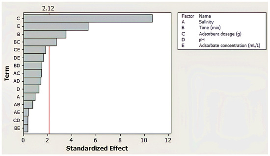 The results of the fractional factorial design revealed that Time, Adsorbent Dose, Adsorbate Concentration, and the Time × Adsorbent Dose interaction were statistically significant (p ≤ 0.05), whereas Salinity and pH showed no significant effect. The Pareto chart (Figure 3) confirms that adsorbent dose had the most pronounced effect on oil adsorption, followed by oil concentration and contact time. This clear presentation highlights that the adsorption capacity of raw coconut fibers is strongly dependent on operational conditions, with dose, concentration, and contact time being the most relevant factors.