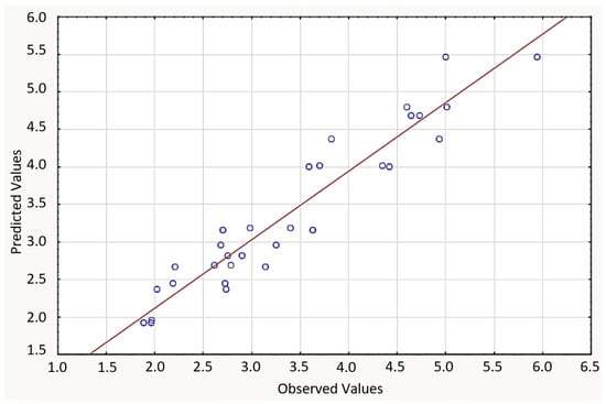 Analysis of variance (ANOVA) confirmed that the factors adsorbent dose, adsorbate concentration, and contact time, as well as the time × dose interaction, were statistically significant (p ≤ 0.05), whereas salinity and pH were not significant. The model presented a coefficient of determination of R2 = 91.5% and an adjusted R2 = 83.5%, indicating high explanatory capacity. The plot of observed versus predicted values (Figure 4) further supports the quality of the fit, showing that the points are distributed close to the line of equality without relevant systematic deviations. These results demonstrate the adequacy of the linear model in representing the adsorption process and confirm its predictive utility under conditions similar to those evaluated experimentally.
