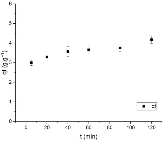 The kinetic and adsorption results are shown for coconut fiber in contact with crude oil from the Campos Basin, Brazil. Figure 5 illustrates the evolution of the adsorbed oil quantity (qt) as a function of time (t), ranging from 0 to 120 min. It can be observed that as the contact time increases, the amount of oil adsorbed also increases, reaching a plateau after approximately 120 min with an adsorption of 4.18 ± 0.19 g·g−1, indicating that the system had reached equilibrium, where no further significant adsorption occurred.