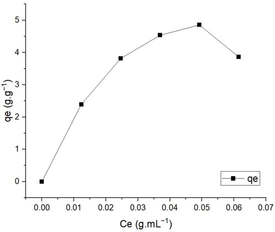 Adsorption equilibrium is another essential parameter for evaluating the efficiency of an adsorbent, as it defines the maximum adsorption capacity under specific process conditions. The adsorption equilibrium curve for oil removal using coconut fiber is presented in Figure 6. From the graph analysis, it is observed that adsorption increases with the increase in oil concentration in the solution, reaching a saturation point around 0.05 g·mL−1. Above this concentration, a slight reduction in adsorption capacity occurs, indicating the maximum occupancy of the active sites on the coconut fiber and possible competitive effects between the adsorbed molecules. This phenomenon can be explained by the progressive saturation of the active sites and the aggregation of oil molecules at high concentrations, reducing adsorption efficiency [].