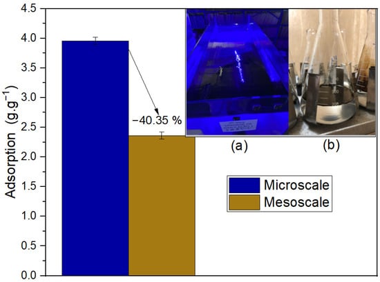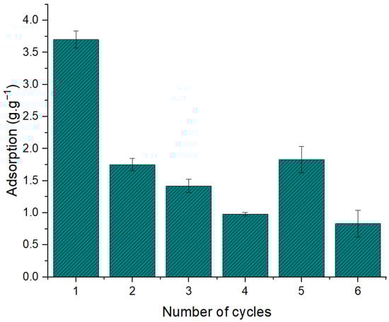 Despite this behavior, statistical analysis of the data using the Tukey test revealed no significant difference in the results over time. In just 5 min, the adsorption was 3.01 ± 0.15 g·g−1, suggesting that in a short period, the adsorption process approaches equilibrium. This is particularly advantageous in situations that require a rapid response, such as oil spill containment. These findings are consistent with the literature, as previously mentioned, where time is the third most significant main effect, showing better adsorption results in the low configuration. This conclusion is particularly relevant because, during an oil spill, minimizing the response time of the applied technology is crucial. By doing so, the risks of further oil spread and secondary contamination are reduced. This behavior is in agreement with several studies in the literature, which report that adsorption tends to increase significantly during the initial minutes of contact. This phenomenon occurs because, initially, the active sites are abundantly available and are quickly occupied. Over time, the interaction proceeds more gradually [,].