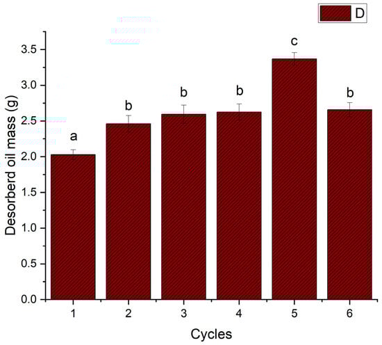 The recovery and reuse of the adsorbent material were evaluated over five consecutive adsorption–desorption cycles. The desorption process was carried out by centrifugation, a physical technique that can be advantageous for practical applications since it does not require the use of chemical reagents to remove the adsorbed oil. This procedure is feasible due to the simultaneous occurrence of physical and chemical adsorption on the biosorbents, allowing efficient oil removal without the need for additional substances []. After each desorption cycle, gravimetric analysis was performed to quantify the desorbed oil. The biosorbent material, already separated from the oil, was reused in a new adsorption cycle, and the adsorption tests were repeated while maintaining the experimental parameters defined in the previous trials. The adsorption capacity of the material was monitored throughout the cycles to evaluate the maintenance of its efficiency. The variation in adsorption capacity between cycles was analyzed to verify the stability and feasibility of the adsorbent material for reuse in oil spill remediation.