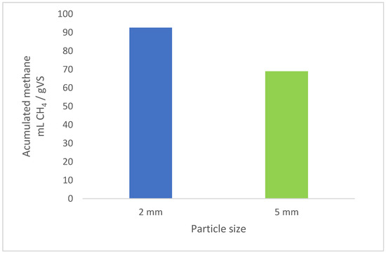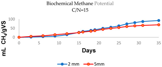 Figure 3 shows the accumulated methane production for a particle size of 2 mm and a C:N ratio of 15, with a performance of 92.62 mL CH4/gVS (blue line), whereas for 5 mm particles, 68.99 mL CH4/gVS was obtained under the same conditions (red line). However, these values are lower than those reported for other species of the Sargassum spp. genus, whose production ranges varied between 116.72 and 139.7 mL CH4/gVS [53,62]. Generally speaking, methane production for marine macroalgae oscillates between 120 and 280 mL CH4/gVS [55,63,64], indicating that the values obtained in this study are lower than the expected values.