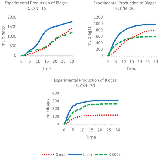 Graphs showing the relationship between the generation of biogas and particle size with C:N ratio = 15, 20, and 30.