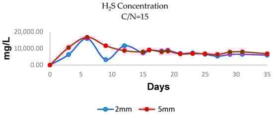 A graph of H2S generation in the experimental reactor with C:N = 15 can be seen in Figure 4; the H2S analysis via gas chromatography identified that higher concentrations were recorded within the first 6 days of the process, reaching a maximum peak on day 6. This indicates intense activity in sulphur bioconversion by the sulphate-reducing bacteria, which can affect methane production during this stage. From day 15, stabilization in the system was observed, as well as an increase in CH4 production, indicating favourable conditions for methanogenic archaea activity. However, H2S concentrations remained elevated, which suggests the need to implement technologies to purify and eliminate H2S in order to reduce health risks and prevent damage to the equipment [53].