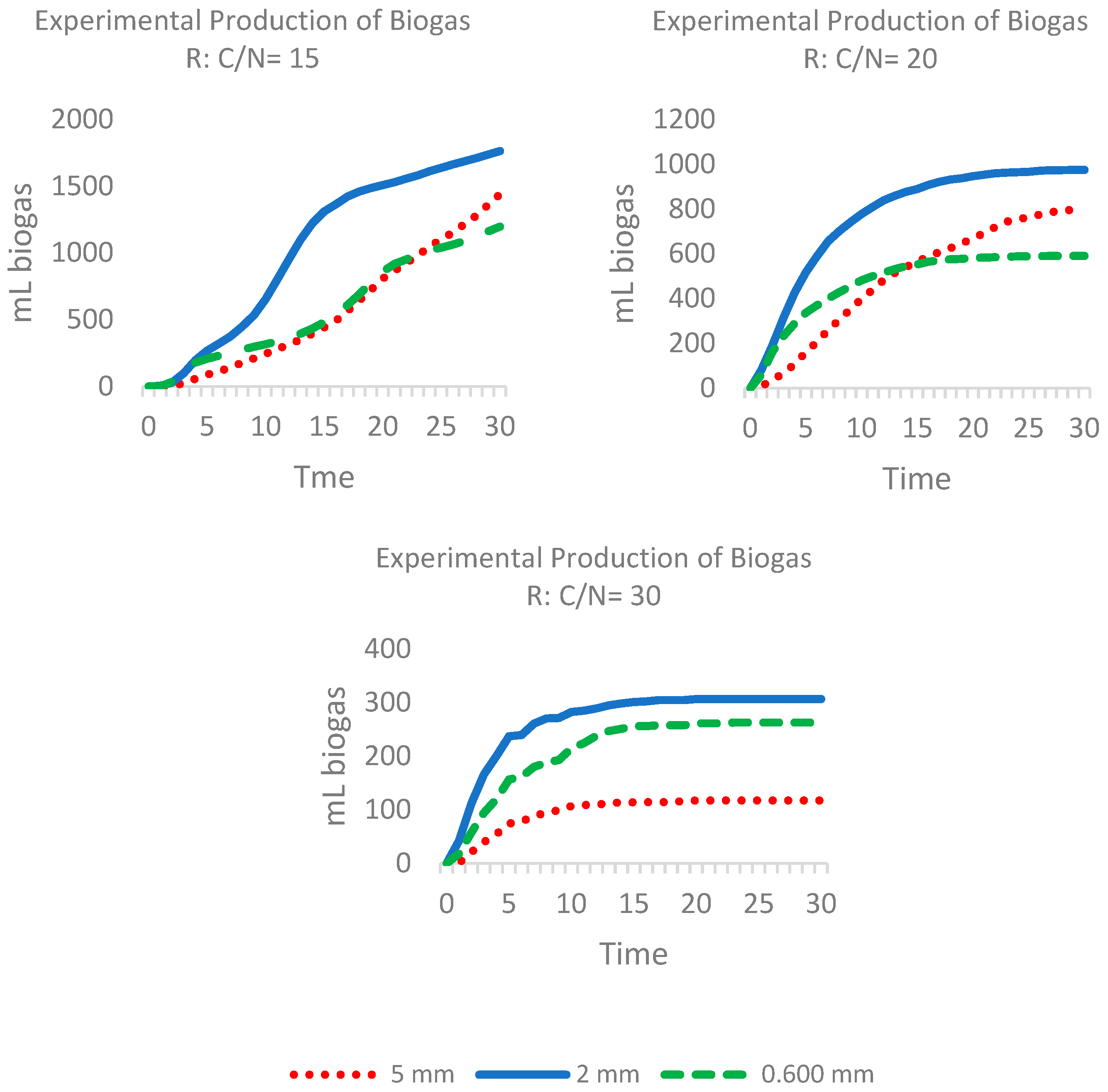 Analysis of biogas production according to the C:N ratio and particle size showed that a C:N ratio of 15 favours greater biogas accumulation, regardless of the particle size evaluated. However, C:N ratios of 20 and 30 showed a progressive decrease in biogas generation which suggests less efficiency in substrate decomposition. This pattern was consistent in the three particle sizes analyzed (5 mm, 2 mm, and 0.6 mm), confirming that a C:N ratio of 15 optimizes microbial activity and the conversion of organic material into biogas. However, higher C:N ratios could generate an imbalance in the availability of carbon and nitrogen, limiting the metabolism of the microorganisms involved in AD and reducing the efficiency of the process.