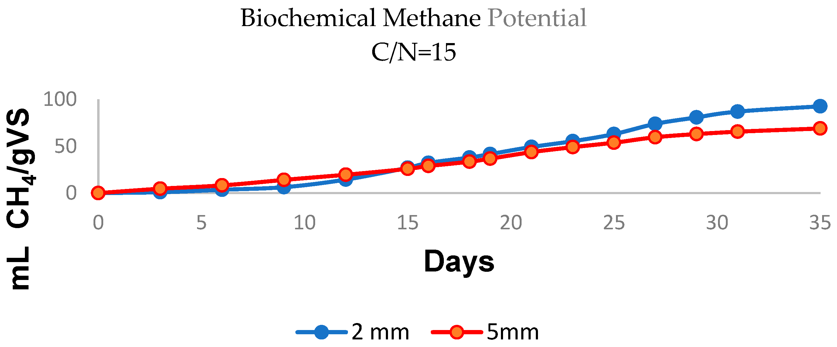 Figure 1). This difference may be explained by the lesser physical availability of the carbon and nitrogen in larger sized particles, which reduces their use by microorganisms, resulting in lower methane production. Furthermore, if the structure of the particle collapses, this can hinder the freeing of gases and generate conditions of microbial intoxication that slow down metabolism.