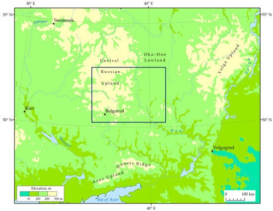 The study area is located on the East European Plain in the forest-steppe zone within the Central Chernozem region. A significant portion of the region lies within the Central Russian Upland (Figure 1), with altitudes ranging from 80 to 300 m. Slopes are common in the region. Another characteristic feature is the fluvial network of small rivers [59], along with an extensive ravine system [60]. The total length of ravines in the southern part of the Central Russian Upland exceeds 10,000 km [61,62].