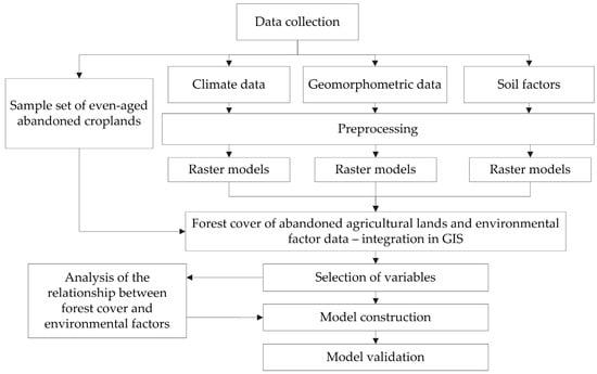 Based on these rasters, values of specific environmental factors were calculated for individual abandoned lands using geoinformation tools. This yielded the required dataset. It contained information on the forest cover of postagrogenic lands and the corresponding climatic, geomorphological, and soil characteristics. After combining the information on forest cover of postagrogenic lands and various environmental factors using geoinformation tools, a statistical analysis was performed. This analysis used the dataset obtained in the previous stage as input. The final stage consisted of statistical analysis of the data. At this step, the relationship between environmental factors and forest cover of abandoned agricultural lands was studied and multivariate regression models were calculated.