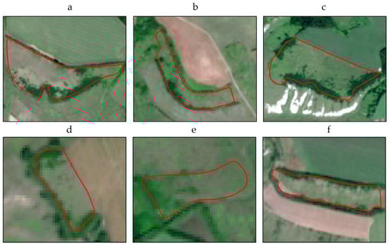 Examples of abandoned cropland in the south of the Central Russian Upland (a–f) in Sentinel-2 images. Synthesis of 4–3–2 bands.